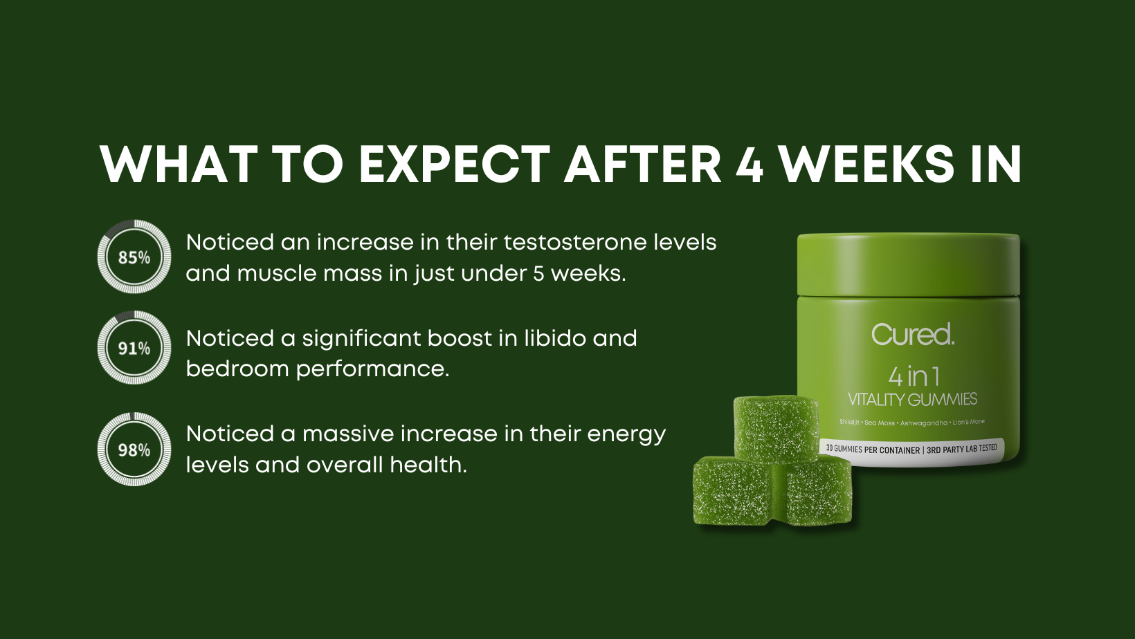 If you use CURED® 4-in-1 Wellness Gummies for 30 days and don't experience an increase in your testosterone, sexual health, energy, and more, send an email to info@trycured.com we'll give you full refund.